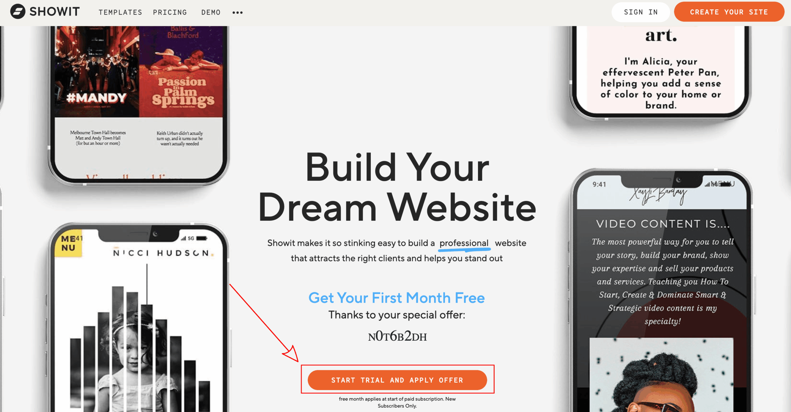 1. Go to showit.com using my referral link to get 30 days free. This gives you two extra weeks compared to signing up directly on their website.