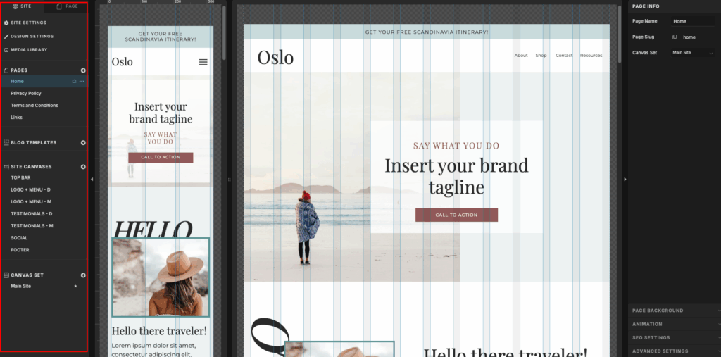 On the left side of your website editor, you will see a menu with all the different sites included in your Oslo Template (see image below). In this section, I will go through the different categories so you will understand what they are and how to use them.