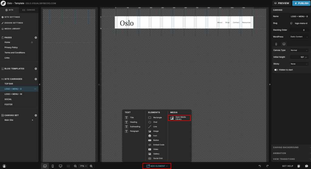 In the Oslo Template, the “logo” is just a title element with the name written in it. If you want to use your own logo, just delete the element and upload and add the logo from the Media Library (see image below).