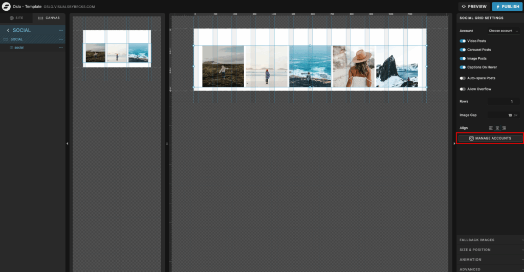 The Social grid is where you can link your Instagram account to show images from your feed. To connect your account, click on the grid and then on manage accounts on the right side. It will take you to your dashboard, and from here you can connect it.