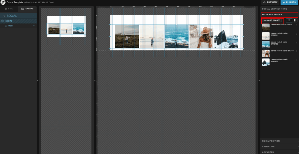 If you don’t want to connect your Instagram account, but still want the grid, you can choose to add fallback images. You will see that this is the case for this template when you import it. Find Fallabk images on the right side and click manage images.