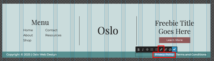 The banner underneath the footer is part of the footer canvas. Here I usually put the copyright info, and the links to the privacy policy and terms and conditions. These are inline links, so you will have to select where the text you want to use as links, and a pop-up will appear over the text. Here, you can click the link button and link to the page or URL you want.