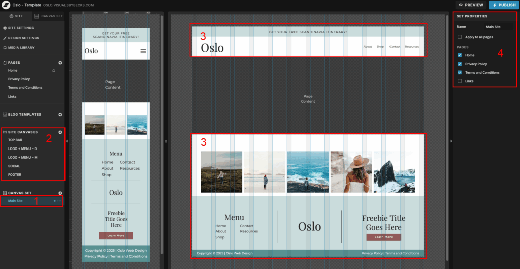 If you click on Main Site (#1), the canvas sets that are included in the Oslo Template, you will see different site canvases (#2) being put together to create a set (#3). In the Oslo Template, the Main Site canvas set includes the Top Bar, Navigation Menu, Social, and Footer. You can also choose what pages you want the set to appear on (#4). By default, the Main Site canvas is set to show on all pages except the Links page.