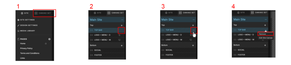 If you want to remove a canvas from the set, click Canvas set (#1), hover over the canvas you want to remove in the left bar (#2), and move it so the three dots show up (#3). Click on the 3 dots and click “Remove” (#4)